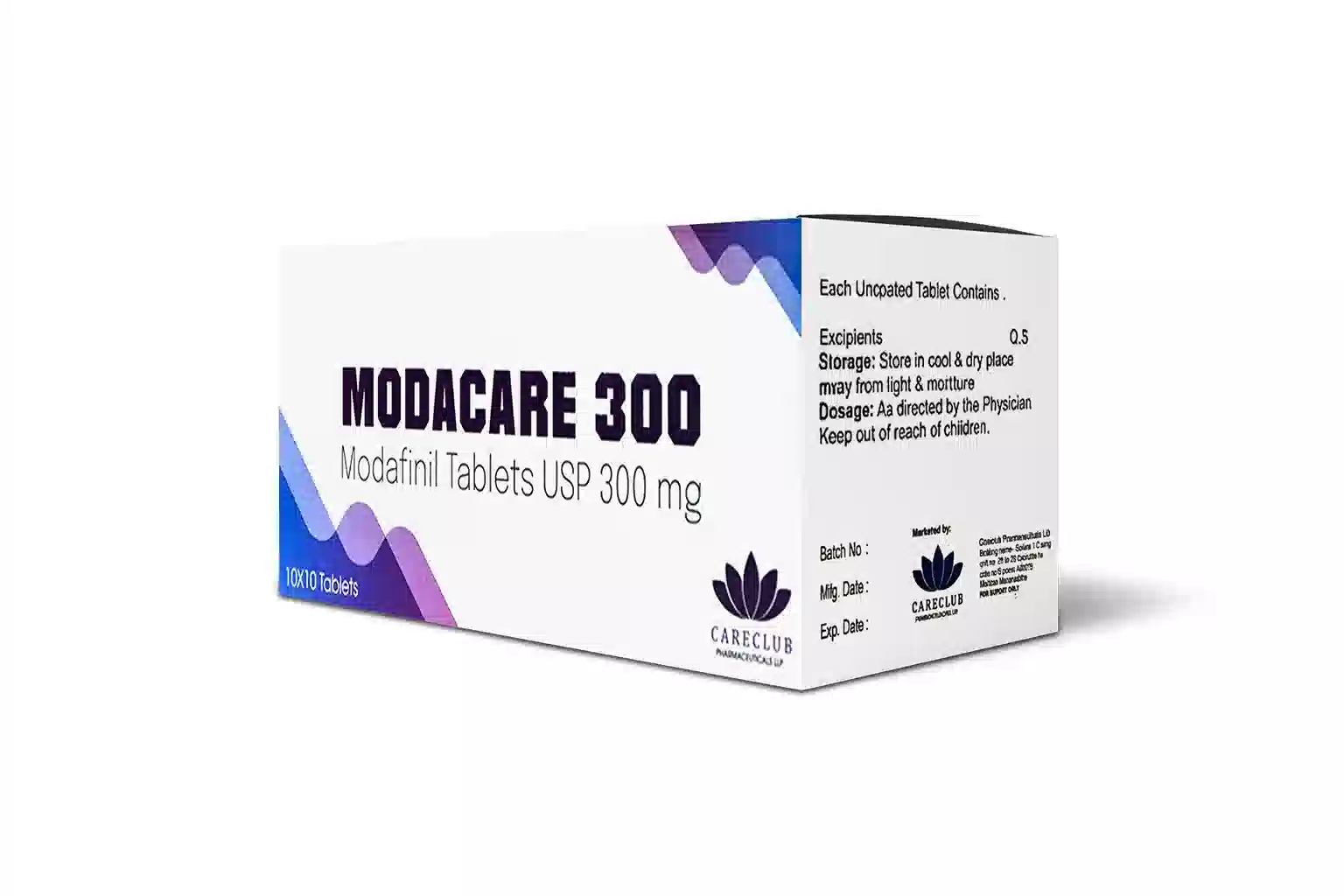 Modacare 300 mg is a drug known to be as Wake-promoting medication, or Nootropic or Stimulant that may contains Modafinil as an active ingredient and is used to treat excessive sleepiness associated with Narcolepsy, Obstructive sleep Apnea (OSA), and shift-work disorder (SWD). It works by stimulating the release of neurotransmitters like dopamine, norepinephrine etc.