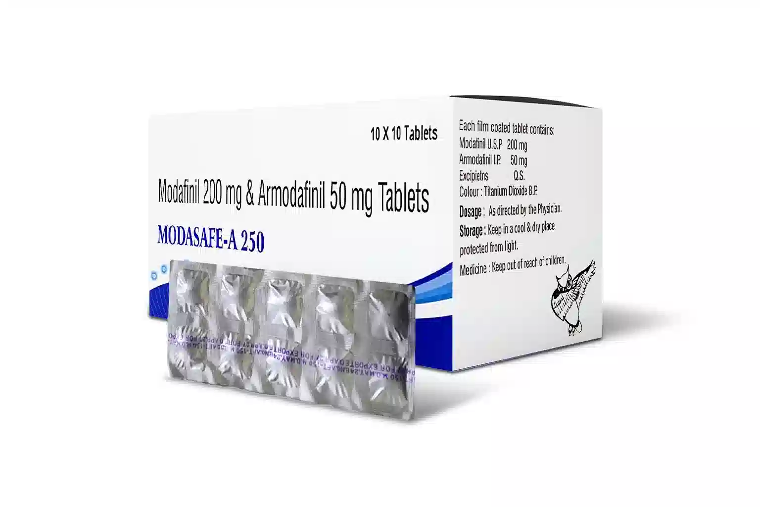 Modasafe A 250 MG is a specialized pharmaceutical formulation combining Modafinil (200mg) and Armodafinil (50mg). It is designed to treat sleep-related disorders and promote wakefulness while enhancing cognitive performance. This dual-action medication effectively addresses conditions like narcolepsy, obstructive sleep apnea (OSA), and shift work sleep disorder (SWSD) while also being used off-label for boosting focus, productivity, and combating fatigue.